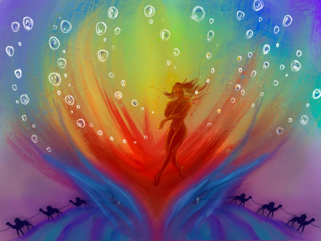 Como sé que si llegara a ser viable esta idea que propongo, lo sería dentro de muchísimo tiempo y probablemente no llegara a disfrutarlo, lo visualizo a través de este dibujo (no es mío, es de @diegotttoro, hecho hace unos 4 años) donde la figura central representaría a la humanidad buscando justicia y equilibrio, mientras los colores y las burbujas reflejan cómo diferentes fuerzas culturales y espirituales interactúan para alcanzar este ideal. A su vez, sugiriendo que las creencias en lo intangible (pensamiento mágico) pueden motivar acciones y guiar a las personas en búsqueda de propósito o justicia global.