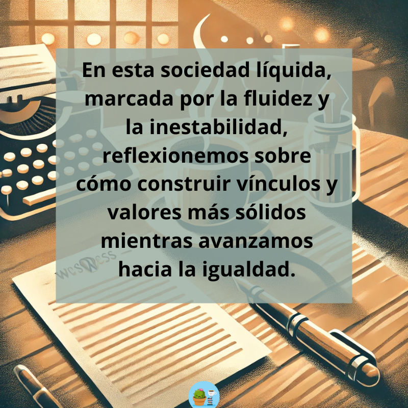 Luego está la ambigüedad y la falta de precisión en el discurso, que parece un síntoma más de esta sociedad líquida. No hay consenso sobre normas y valores sociales, y tendemos a evitar afirmaciones categóricas o compromisos ideológicos firmes por miedo al rechazo, la polémica o el conflicto. Ayer mismo una amiga me pasó un texto desgarrador sobre violencias sufridas que no quiere compartir por evitar ser etiquetada. Pero aquí, se invita a lo contrario: a no temerle a la claridad ni al compromiso. Nombrar la violencia de género por lo que es, visibilizar las estructuras de poder que la sostienen y plantear soluciones contundentes son acciones que exigen valentía en un mundo donde las palabras a menudo se diluyen. Si bien es cierto que la sociedad líquida nos permite escapar de normas opresivas, también puede dificultar la construcción de consensos sólidos sobre derechos fundamentales. Por eso, es importante equilibrar la flexibilidad con un discurso claro y decidido en torno a la igualdad.